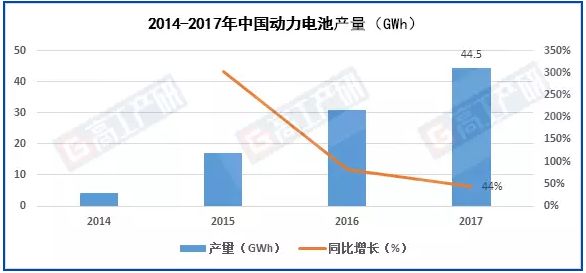 高工产研锂电研究所(GGII)调研数据显示,2017年中国动力电池产量44.5GWh,同比增长44%。