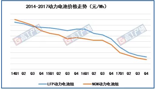 GGII数据显示,2017年年底动力电池价格较2017年初下滑20%~25%。磷酸铁锂电池组价格从年初的1.8~1.9元/Wh下降到年底的1.45~1.55元/Wh。三元动力电池包价格从年初的1.7~1.8元/Wh下降到年底的1.4~1.5元/Wh。